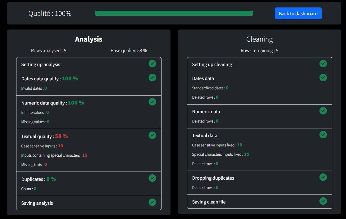 - Une fois terminé, vous pourrez revenir sur votre tableau de bord et consulter le fichier nettoyé en cliquant sur l'icône .