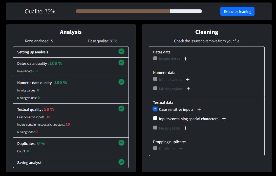 - Attendez que l'analyse de qualité soit terminée. Des cases à cocher apparaîtront pour chaque type d'anomalies détectées.