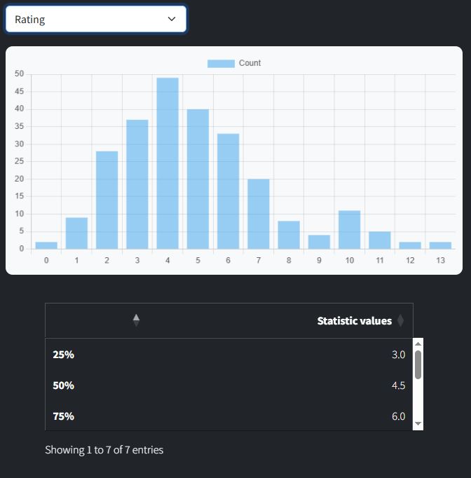 Vous pourrez aussi voir la répartition de vos données grâce à un histogramme pour tous les types de données. L'histogramme des données textuelles est en réalité un top 10 des valeurs les plus fréquentes.