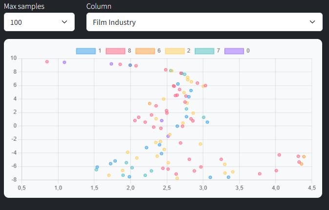 Vous pourrez voir une représentation 2D de vos données grâce à un nuage de points obtenu par une méthode nommée t-SNE. Cette représentation vous permettra de voir la répartition de vos données et de voir s'il y a des groupes de données qui se dégagent. Si vous avez des colonnes de type catégoriel, vous pourrez voir la répartition de vos données en fonction de ces colonnes.